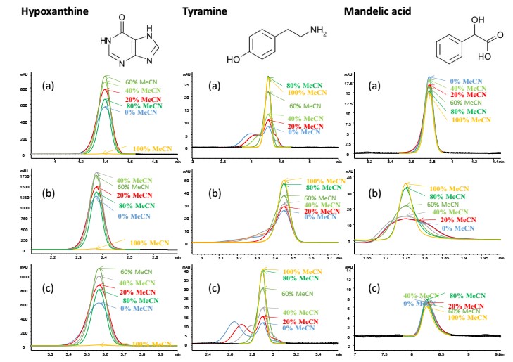 次黃嘌呤(極性中性)的峰形一般隨著乙腈濃度的增加而改善,最佳的有機溶劑含量在60-80%左右。酪胺(堿性)在低百分比有機相稀釋劑條件下,HILIC-B和HILIC-N上出現分裂峰, HILIC-A峰形很差。當乙腈的濃度大于60%,峰形得到顯著的改善。扁桃酸的峰形在HILIC-B和HILIC-N相上受稀釋劑的影響較小,而對于HILIC-A相,在高水濃度下峰形較差??偟膩碚f,從這個數據集合來看,對于這個應用,樣品推薦使用由60-80%有機相組成的稀釋劑。