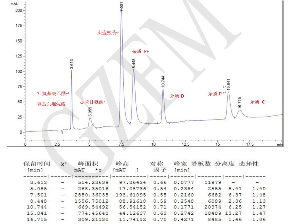 案例說明:7-氨基去乙酰氧基頭孢烷酸峰與ɑ-苯甘氨酸峰之間的分離度應符合要求;系統適用性溶液色譜 圖中,頭孢氨芐峰與相鄰雜質峰之間的分離度應符合要求。