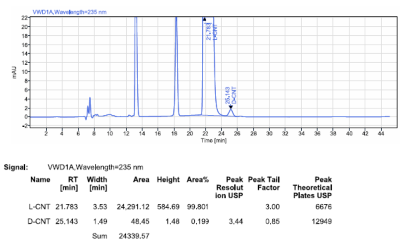 說明及客戶評價:相比于USP方法,本方法不受衍生化試劑手性純度影響,分離度和峰型都不錯,檢測靈敏度也滿足方法要求。實際應用中,也有一些客戶選擇Chiral MD(2)-RH 3u 250*4.6mm 獲得更大的分離度與更高的柱效。