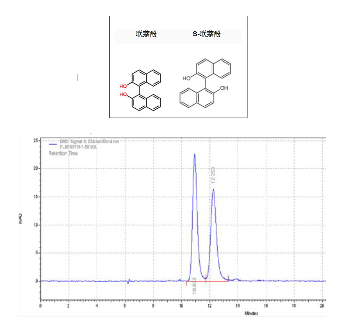 App ID: FLM-B250006 聯(lián)萘酚與S-聯(lián)萘酚的分離 色譜柱:Chiral INC 250*4.6mm,5um (貨號:FMG-JY5-I03) 流速:0.5 mL/min 檢測:波長254nm, 柱溫:25°C 樣品濃度:N/A 進(jìn)樣量:1μ 溶劑:水:甲醇=40:60(V:V) 流動相:咨詢銷售