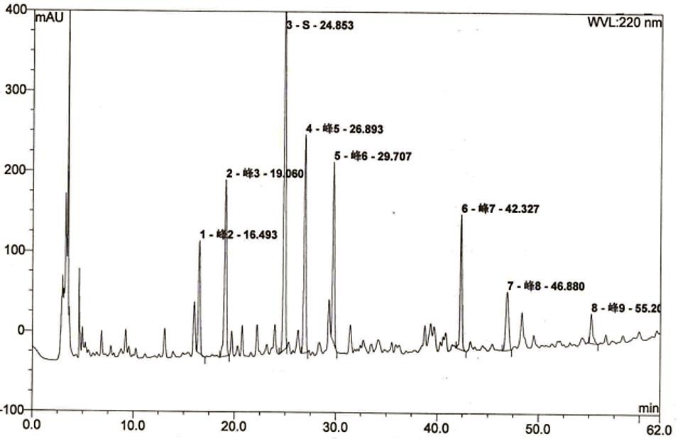 峰 2 為原兒茶酸,峰 4(S)為紫丁香苷,峰 5 為綠原酸,峰 7 為刺五加苷 E,峰 8 為異嗪皮啶
